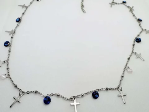 €29,90Υπέροχο κολιέ σε ασημί χρώμα από ανοξείδωτο ατσάλι. Έχει στοιχεία Swarovski σε Bermuda blue χρώμα και διάφανο ιριδίζον χρώμα. Οι σταυροί είναι από ανοξείδωτο ατσάλι και είναι ένας εξαιρετικά εντυπωσιακός συνδυασμός. Τράβηξε όλα τα βλέμματα πάνω σου με τα πιο λαμπερά κοσμήματα. Υποαλλεργικά και ανθεκτικά στο νερό.