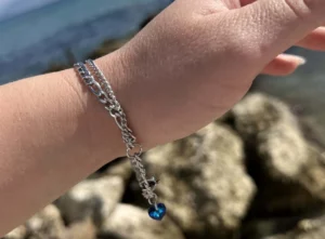 Original price was: €17,50.€14,50Η τρέχουσα τιμή είναι: €14,50.Aτσάλινο βραχιόλι από δύο αλυσίδες ανοξείδωτες που δε μαυρίζουν και δεν προκαλούν αλλεργίες εγγυημένα 100%. Η καρδούλα που βλέπετε είναι κρυστάλλινη swarovski σε μοναδικό λαμπερό χρώμα vermuda blue. Μαγέψτε τους όλους με το στυλ και τα κοσμήματά σας!!!