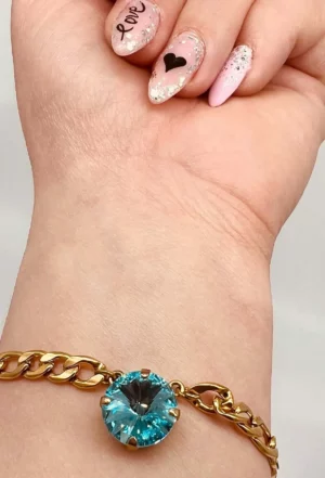 €19,90Βραχιόλι από επιχρυσωμένη αλυσίδα με μία πέτρα aquamarine Swarovski στο κέντρο. Είναι τόσο απλό ,αλλά ταυτόχρονα τόσο λαμπερό που μαγνητίζει τα βλέμματα. Φόρεσέ το μόνο του,συνδύασέ το όπως εσύ θέλεις και προσάρμοσέ το στην καθημερινή σου εμφάνιση.