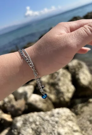 Original price was: €17,50.€14,50Η τρέχουσα τιμή είναι: €14,50.Aτσάλινο βραχιόλι από δύο αλυσίδες ανοξείδωτες που δε μαυρίζουν και δεν προκαλούν αλλεργίες εγγυημένα 100%. Η καρδούλα που βλέπετε είναι κρυστάλλινη swarovski σε μοναδικό λαμπερό χρώμα vermuda blue. Μαγέψτε τους όλους με το στυλ και τα κοσμήματά σας!!!