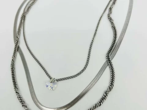 Original price was: €29,90.€23,40Η τρέχουσα τιμή είναι: €23,40.Τριπλό ατσάλινο κολιέ σε ασημί χρώμα για να ακολουθήσετε τις τελευταίες τάσεις της μόδας. Αποτελείται απο μία αλυσίδα snake ,μία πιο λεπτη αλυσίδα με λευκή κρυστάλλινη καρδιά και μία πιο χοντρή αλυσίδα.